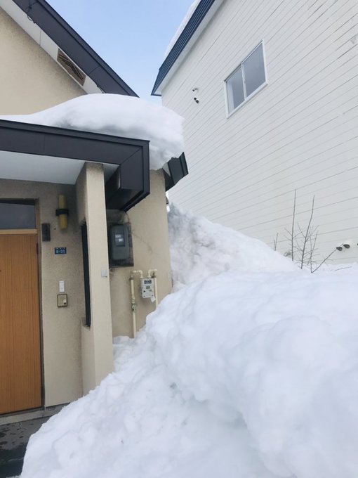 - 15:38:06 : 明日が休みじゃないから無理しないようにしてたけど、それでも疲れ眠りこけていた。玄関の屋根の雪がしぶとく落ちず気になっていたのをスコップで突いたり落ち場所作ったりしてみた。玄関横にはガスメーターがあるから直撃しないようにやってみたんだけど。写真は先週のものたけど。 pic.twitter.com