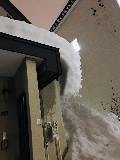 - 15:38:06 : 明日が休みじゃないから無理しないようにしてたけど、それでも疲れ眠りこけていた。玄関の屋根の雪がしぶとく落ちず気になっていたのをスコップで突いたり落ち場所作ったりしてみた。玄関横にはガスメーターがあるから直撃しないようにやってみたんだけど。写真は先週のものたけど。 pic.twitter.com
